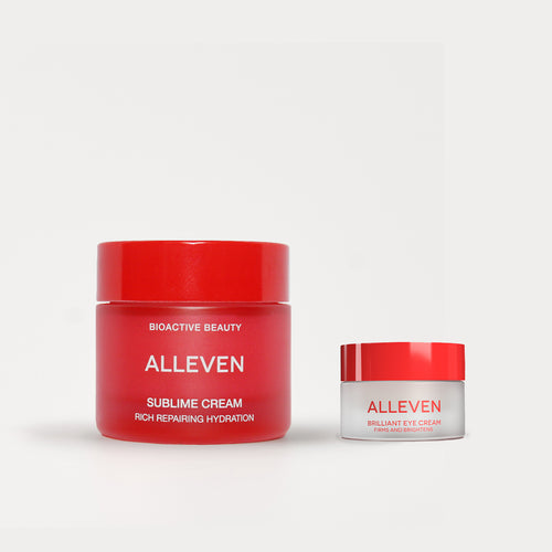 Skin hydration is skin salvation—it blurs what you wish would disappear and brings out your bright side. This ALLEVEN combo has your skin covered from hairline to décolleté. Our Brilliant Eye Cream blends truly effective botanicals and next-gen technology to reduce puffiness, fine lines and dark circles while enhancing texture, promoting firmness and reestablishing radiance. Sublime Cream, a super moisturizer that works day and night, is also clinically proven to deliver immediate and ongoing results, reducing wrinkles, fine lines, uneven texture and hyperpigmentation. It’s clean formula with 7-molecular factors protects against blue light and free radical damage, and restores volume, suppleness and elasticity. With this dynamic duo, expect immediate dewiness with a velvety finish and an ongoing natural youthfulness that looks healthy and fresh.